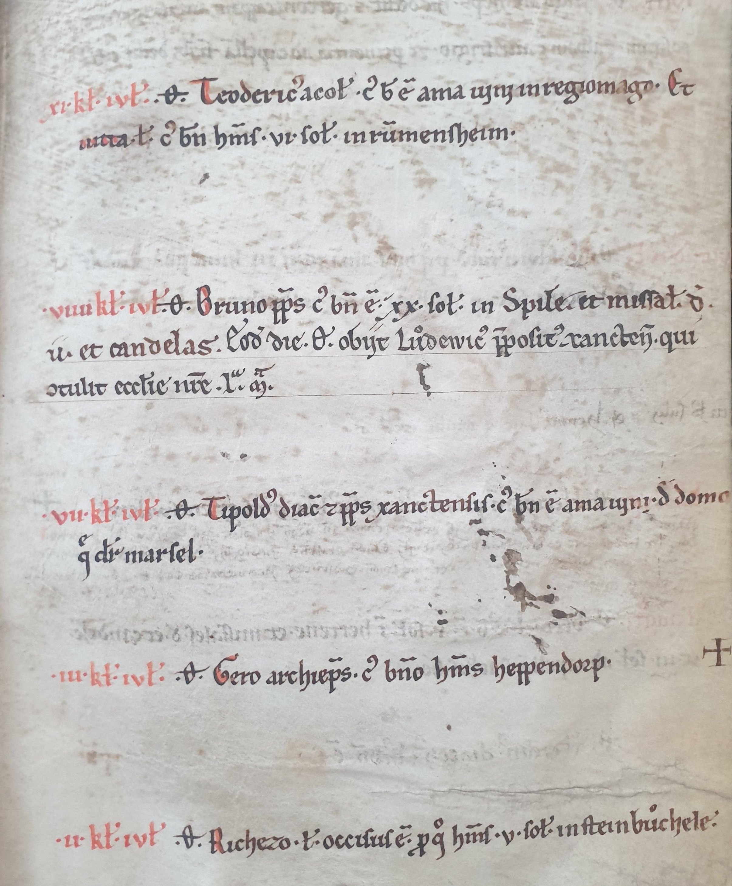 Die rote Datumszeile lautet „un kt ivt“ – wahrscheinlich „undecimo kalendas iulii“, der 11. Juli. Gero starb am 28. Juni 976. Vielleicht war dies sein Beerdigungstag, an dem seiner im Stift liturgisch gedacht wurde.